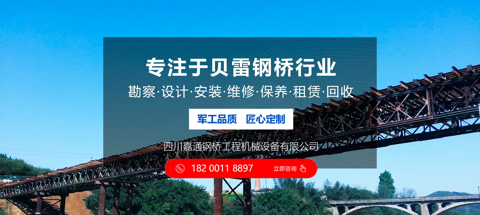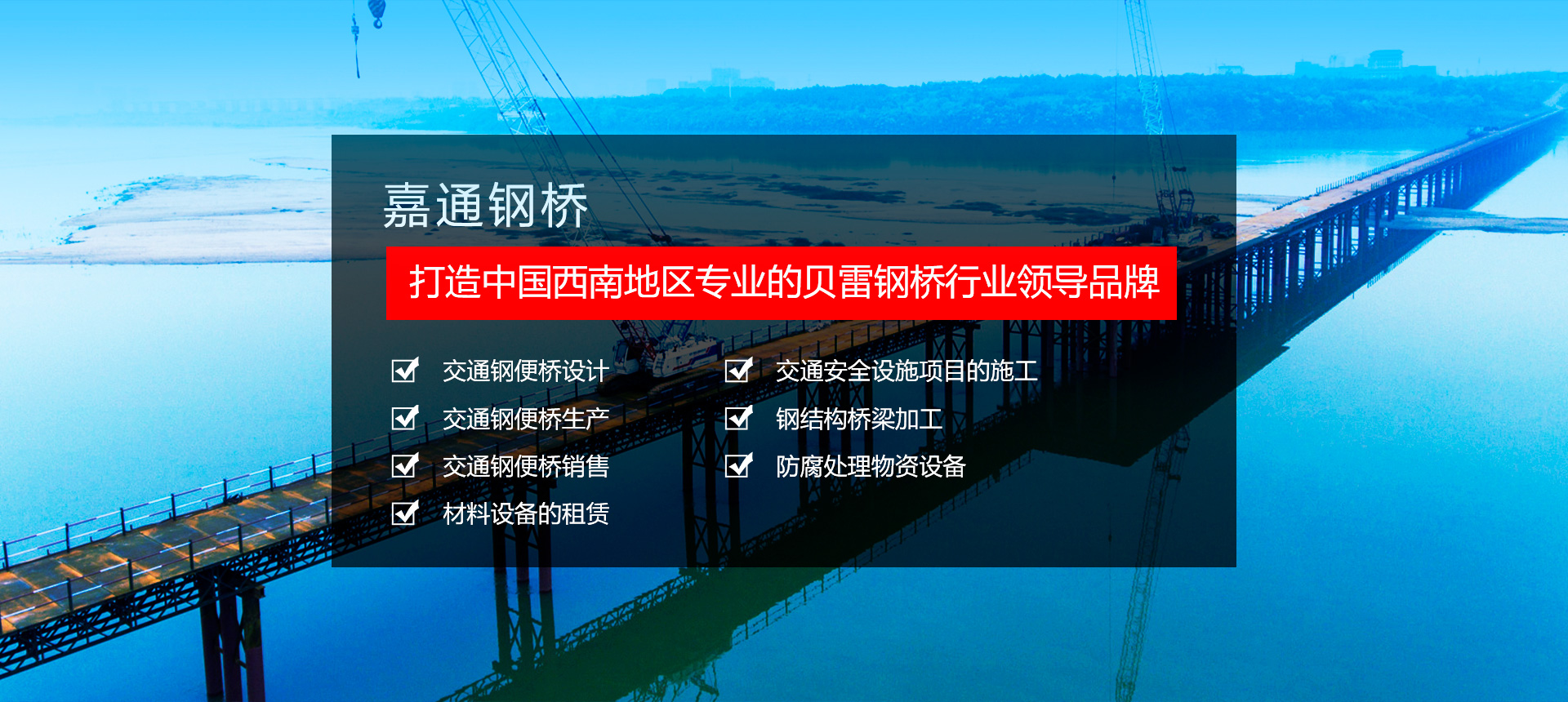 四川嘉通鋼橋工程機(jī)械設(shè)備有限公司坐落于有著天府之國的成都。以成都為中心,西南.西北和華中市場同步發(fā)展,打造中國西南地區(qū)專業(yè)的貝雷鋼橋行業(yè)領(lǐng)導(dǎo)品牌。, 主要從事: 交通鋼便橋的設(shè)計(jì)以及生產(chǎn)銷售 材料設(shè)備的租賃 交通安全設(shè)施項(xiàng)目的施工 鋼結(jié)構(gòu)橋梁加工及防腐處理物資設(shè)備等業(yè)務(wù)。   公司堅(jiān)持 “承諾必須兌現(xiàn)、要約必須履行”的誠信態(tài)度, “質(zhì)量第一、客戶至上”的經(jīng)營理念, 把領(lǐng)先的技術(shù)、卓越的管理和完全以客戶為中心的服務(wù)融為一體,為您提供優(yōu)質(zhì)的產(chǎn)品和完善的服務(wù)。
